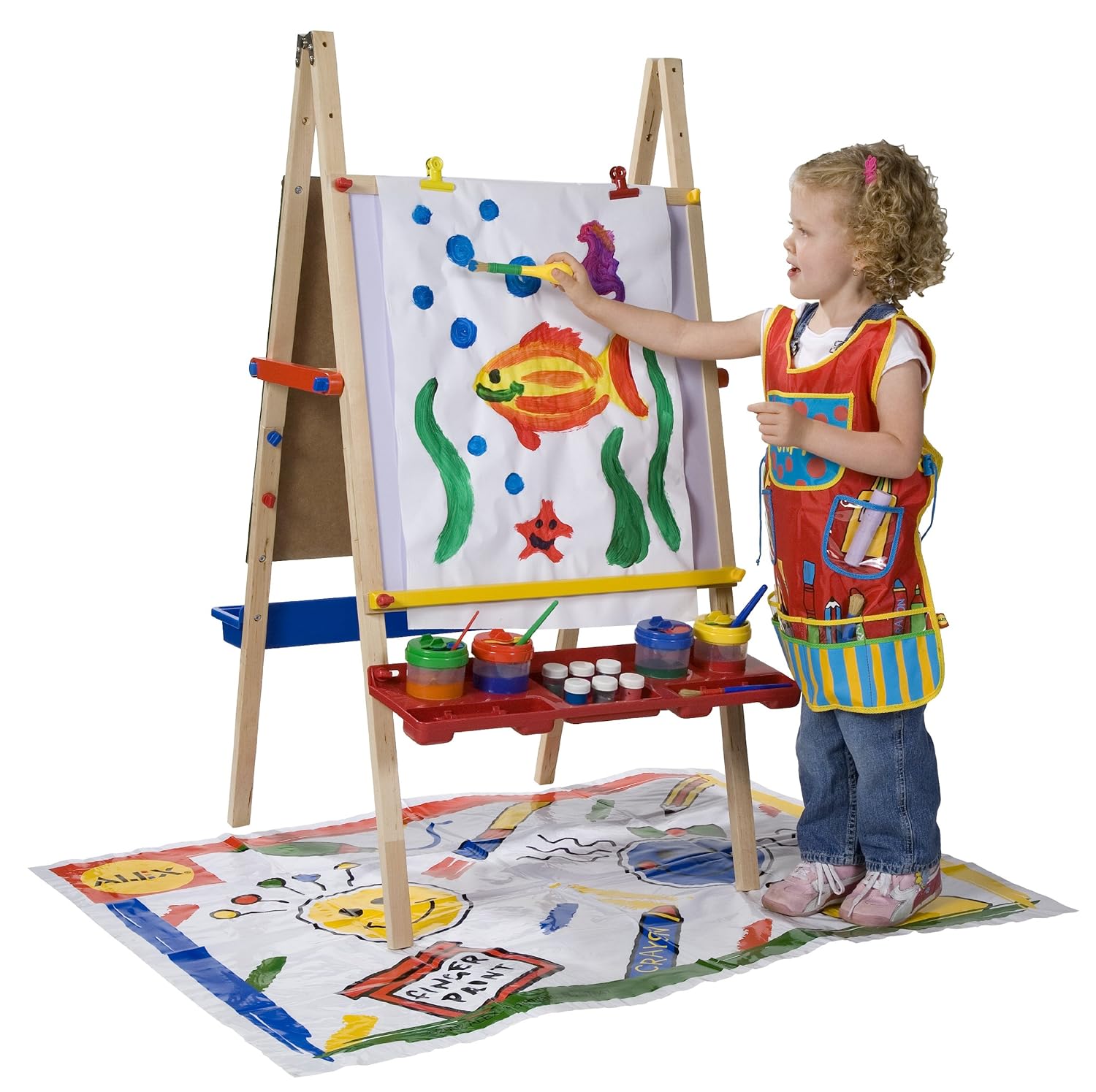 High quality, Easel is height-adjustable wooden easel. Features chalkboard on one side, magnetic wipe-off board on the other. Molded tray holds cups, paints and brushes. Bin-tray holds chalks and other materials. Collapsible for storage. Includes 18″ x 75′ paper roll, sturdy paper cutter and 2 easel clips.